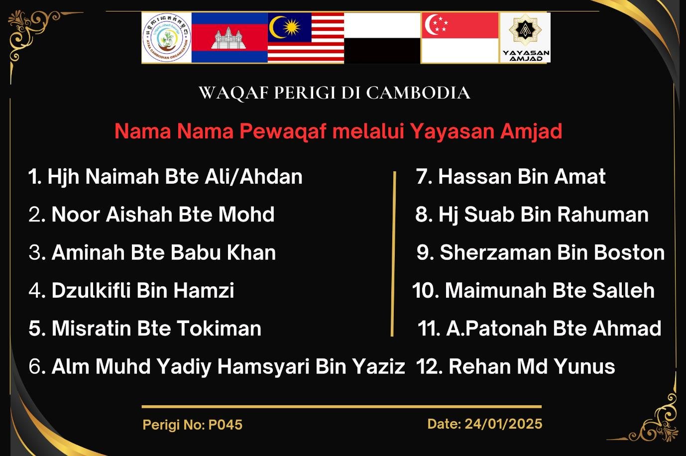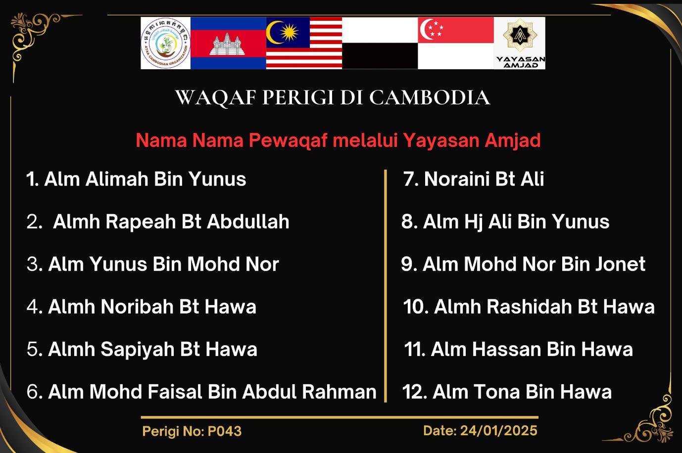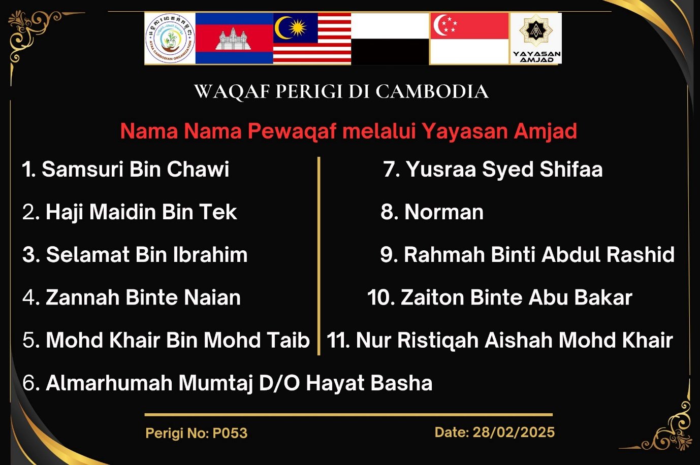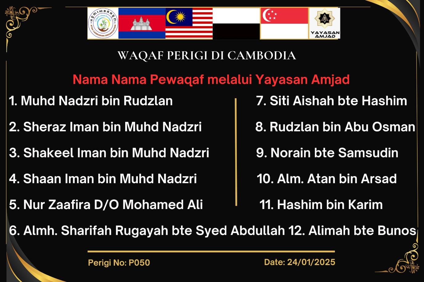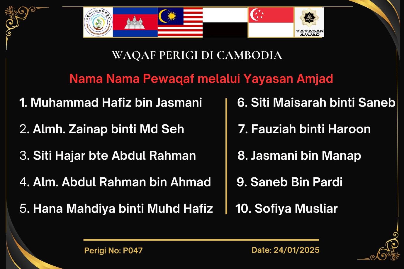 Yayasan Amjad bertindak sebagai wakil bagi menyampaikan sumbangan anda berkerja sama dengan sebuah Yayasan di Kemboja untuk memastikan sehingga terlaksana nya pembinaan perigi-perigi ini. Kami memudahkan urusan anda untuk merebut ganjaran wakaf secara bersama. Peluang sebegini tidak seharusnya disia-siakan, malah ia wajar dikongsi bersama seluruh umat Islam.