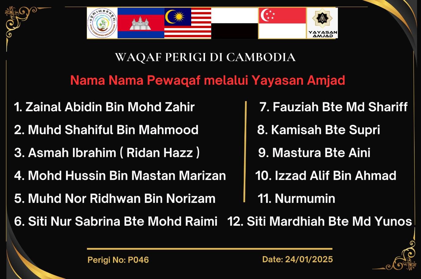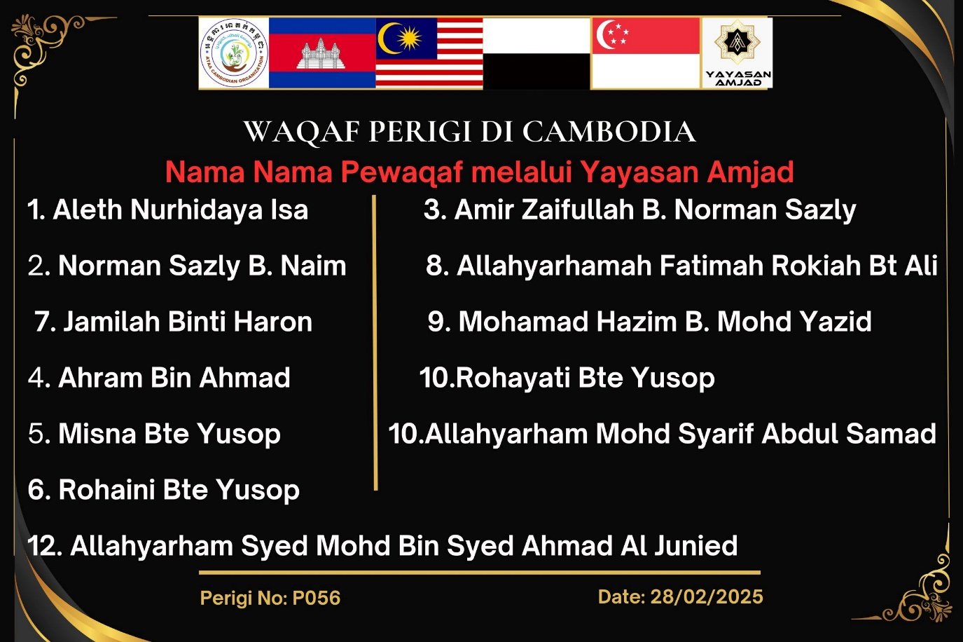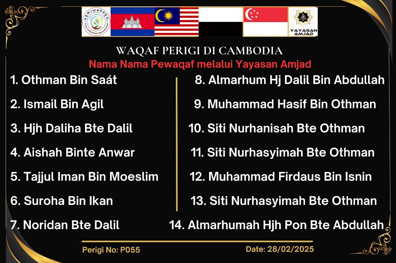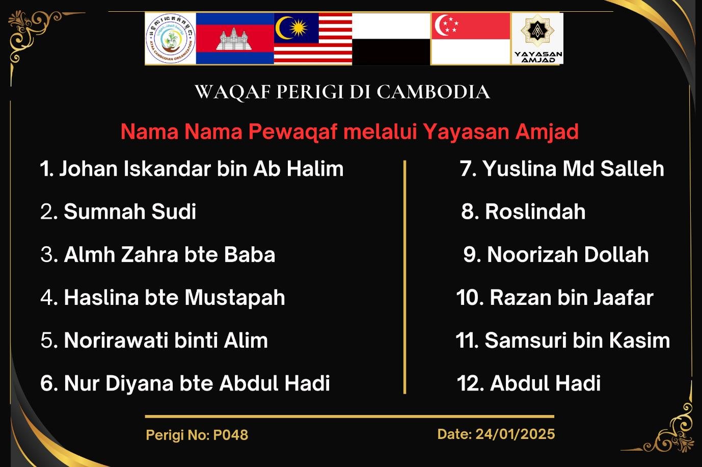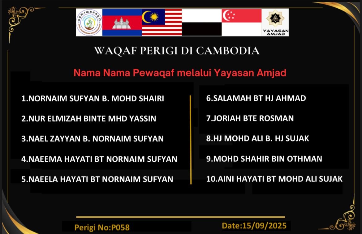 Yayasan Amjad bertindak sebagai wakil bagi menyampaikan sumbangan anda berkerja sama dengan sebuah Yayasan di Kemboja untuk memastikan sehingga terlaksana nya pembinaan perigi-perigi ini. Kami memudahkan urusan anda untuk merebut ganjaran wakaf secara bersama. Peluang sebegini tidak seharusnya disia-siakan, malah ia wajar dikongsi bersama seluruh umat Islam.