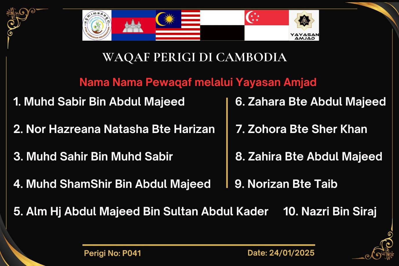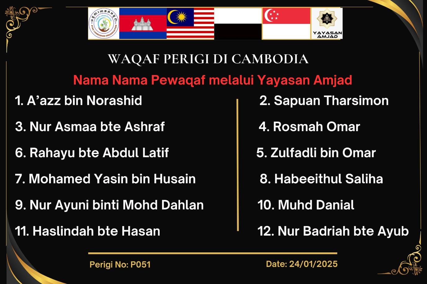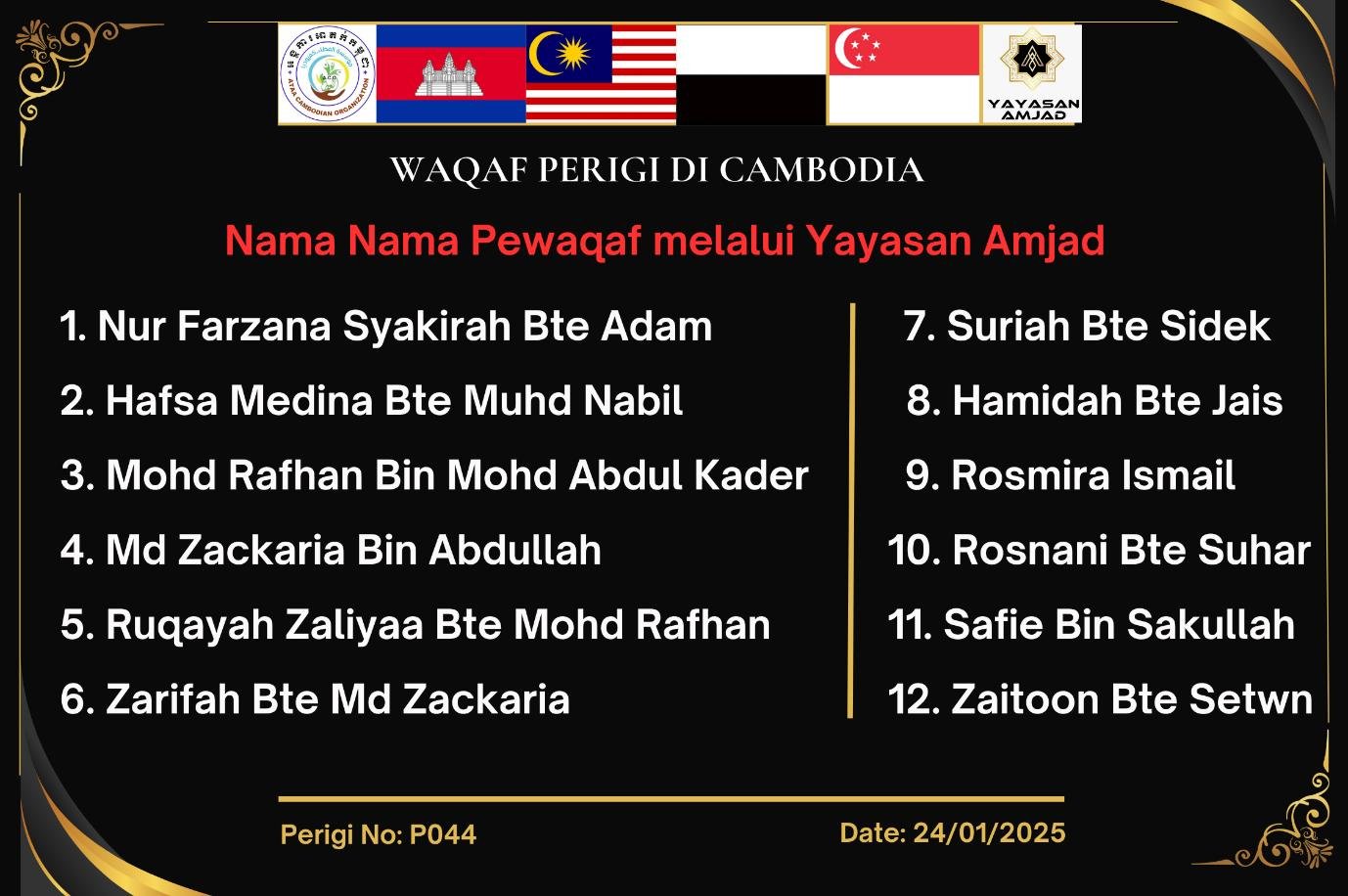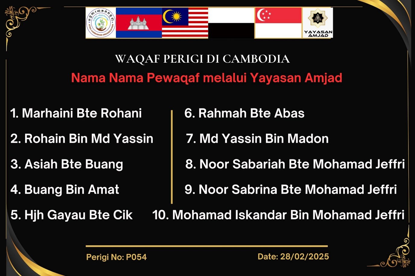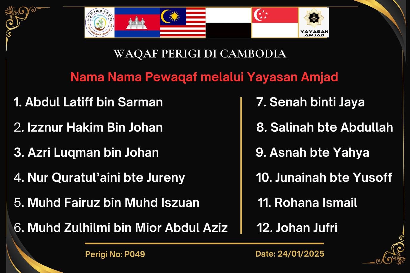 Yayasan Amjad bertindak sebagai wakil bagi menyampaikan sumbangan anda berkerja sama dengan sebuah Yayasan di Kemboja untuk memastikan sehingga terlaksana nya pembinaan perigi-perigi ini. Kami memudahkan urusan anda untuk merebut ganjaran wakaf secara bersama. Peluang sebegini tidak seharusnya disia-siakan, malah ia wajar dikongsi bersama seluruh umat Islam.