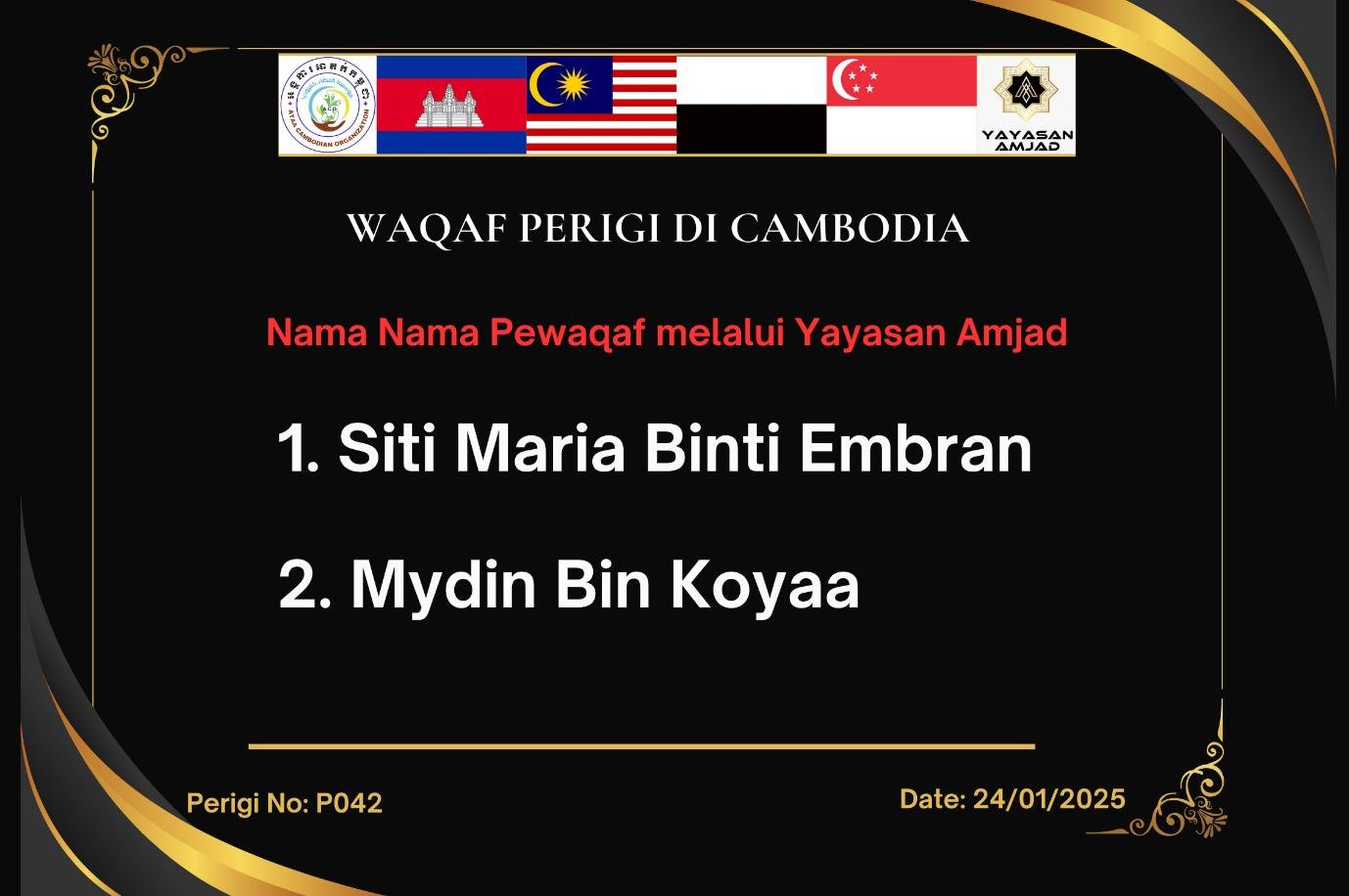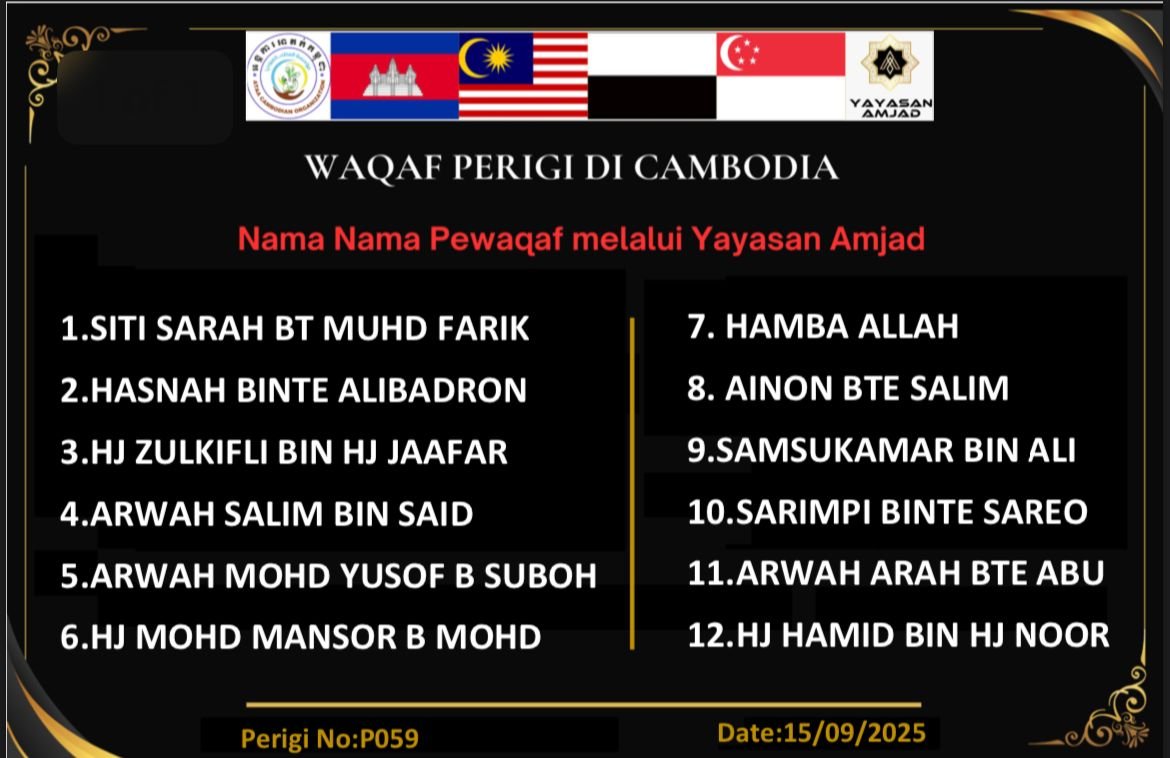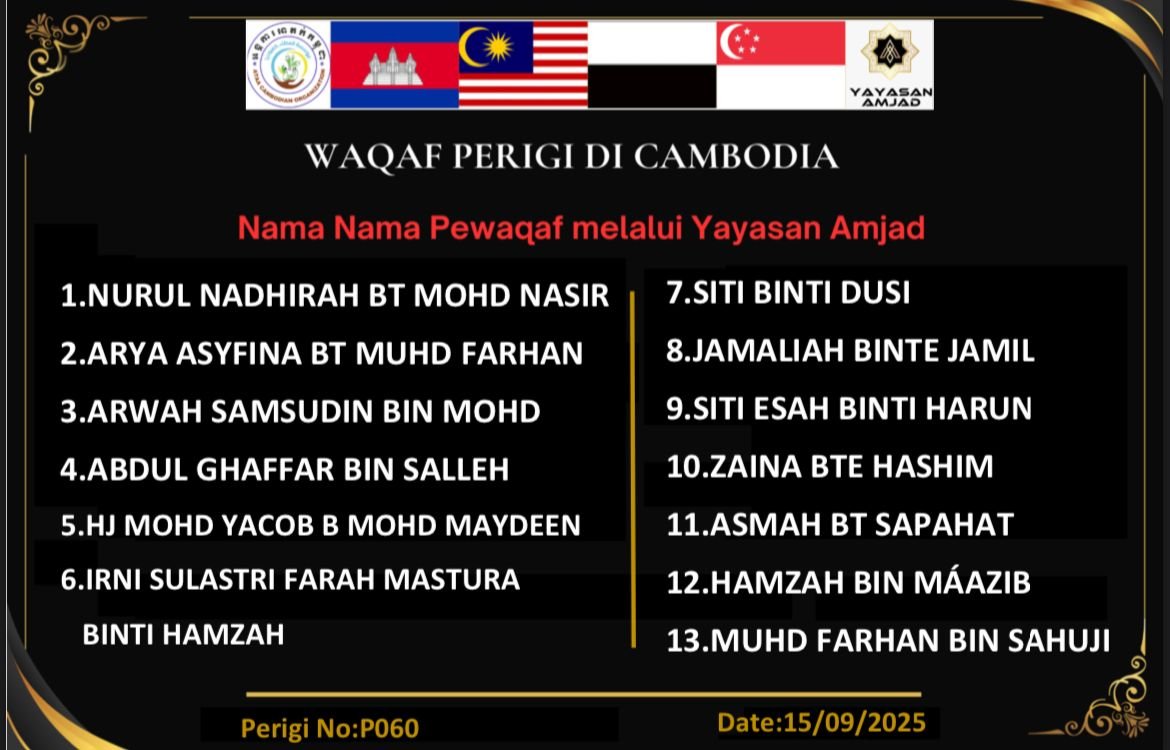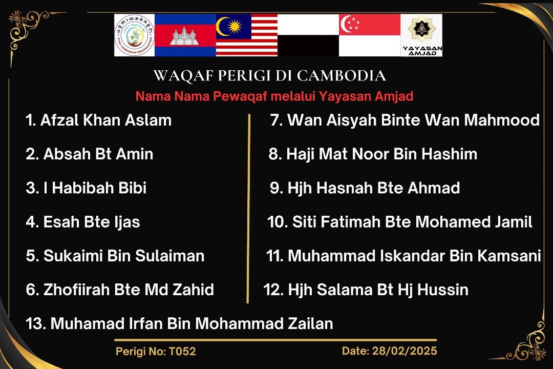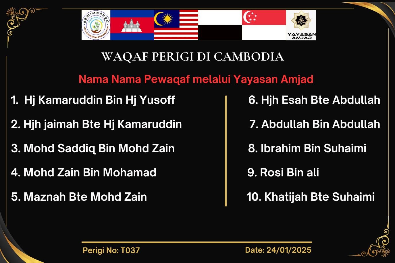 Yayasan Amjad bertindak sebagai wakil bagi menyampaikan sumbangan anda berkerja sama dengan sebuah Yayasan di Kemboja untuk memastikan sehingga terlaksana nya pembinaan perigi-perigi ini. Kami memudahkan urusan anda untuk merebut ganjaran wakaf secara bersama. Peluang sebegini tidak seharusnya disia-siakan, malah ia wajar dikongsi bersama seluruh umat Islam.
